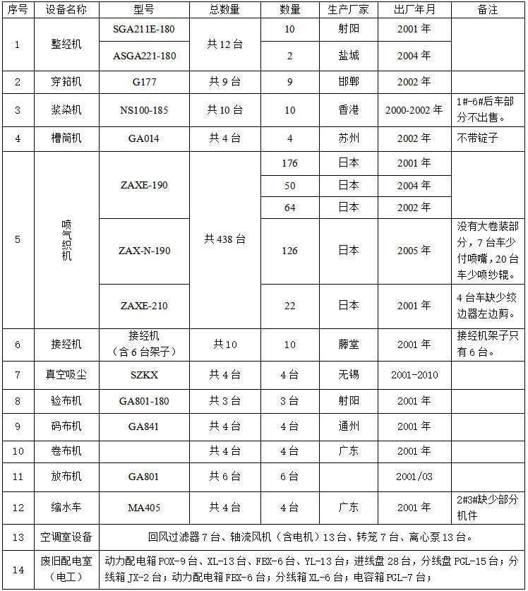 一、因公司新旧动能升级改造,现淘汰部分牛仔布喷气织机设备以及其他配套设备,预对外进行招标出售,具体情况详见清单: