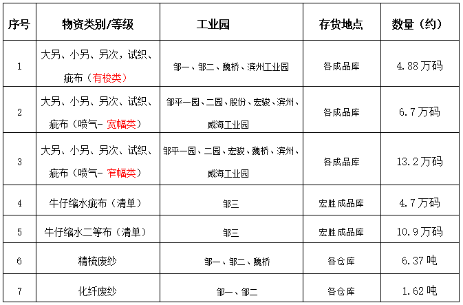 一、有梭、喷气疵布;牛仔疵布、废纱出售项目: